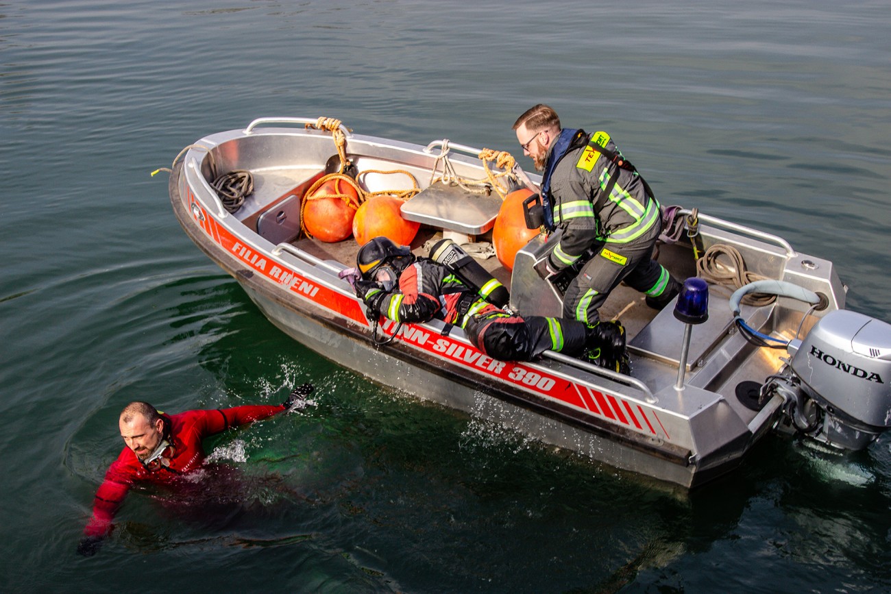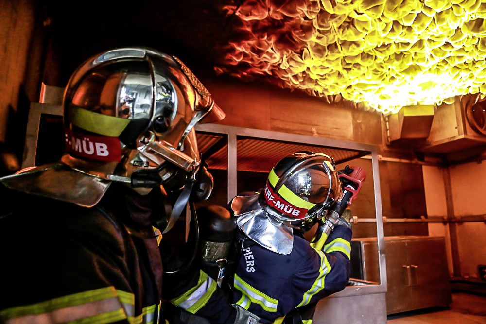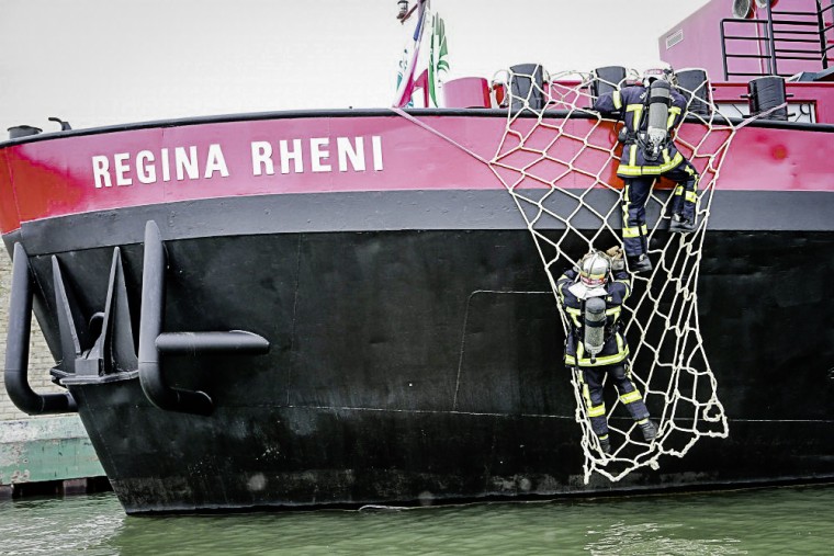 Bei der Führung durch die einzelnen Trainingsabschnitte der MÜB, welche wir von Leutnant Thierry Romilly, dem Kommandanten der MÜB, persönlich erhalten, wird uns langsam klar, warum alle Teilnehmer von „Grenzerfahrungen“ sprechen. Den Anfang stellt die Atemschutz-Übungsanlage dar. Hier wird einem mit komplett angelegtem Atemschutz und Pressluftatmer alles abverlangt. Ein Ergometer, ein Armergometer sowie eine Endlosleiter müssen zur Leistungserhebung „bezwungen“ werden. Wobei man hier eigentlich eher den inneren Schweinehund zu bezwingen hat. Danach geht es in absoluter Dunkelheit über eine 65 m lange Gitterstrecke – den Mäusekäfig. Natürlich noch immer mit angelegtem Atemschutz. Die Strecke bildet die Besonderheiten, die man auf Schiffen wiederfindet, nach: Absteigen durch ein Mannloch, Erkundungen in Laufgängen, im Doppelschiffsrumpf, im Maschinenraum etc. Sie besteht aus Böden unterschiedlicher Materialien und führt über verschiedene Ebenen mit abnehmbaren Hindernissen. Die Teilnehmer haben ausschließlich mit ihrem Tastsinn eine Chance, die Umgebung zu verifizieren. Der Zielraum der Anlage ist der originale Maschinenraum des ehemaligen Tankmotorschiffs. Ziel der Übung ist es, jeden noch so kleinen Raum eines verunfallten Schiffes bei absoluter Dunkelheit auf den Verbleib von Personen oder Hunden zu erkunden. Immerhin können sich in einem Personenschiff bis zu 400 Menschen befinden. Bei uns stellte sich durchaus ein mehr als nur beklemmendes Gefühl bei dieser Station ein. Doch wir waren in bequemer Freizeitkleidung und bei eingeschaltetem Licht im Mäusekäfig. Wer diese Station hinter sich gebracht hat, kann sich endlich wieder auf ein wenig Tageslicht freuen. Diese Freude verfliegt allerdings im Nu, als die nächste Übung von einem der acht auf der MÜB stationierten Ausbilder vorgetragen wird: „Wenn du dich gesammelt hast und sich deine Atmung und dein Puls stabilisiert haben, gehst du zur Absprungkante, springst in den Rhein, versuchst unter Wasser ruhig zu bleiben und lässt dich am Rücken liegend zum Bug treiben. Dort versuchst du über das Netz bzw. die Strickleiter an Bord der MÜB zu gelangen!“ Zur Erinnerung, die Jungs von TEXPORT® befinden sich noch immer in ihren Hightech-Schutzanzügen bei angelegtem Atemschutz. „Das eiskalte Wasser zieht dir die Kraft und Energie so rasch aus dem Körper, ich hätte das nicht für möglich gehalten“, schildert uns einer der Teilnehmer im Anschluss. Auch er zählt zu jenen, denen an der Strickleiter das letzte Quäntchen Kraft und Technik für diese Übung fehlte. Im Übrigen scheiterten an dieser Übung auch schon Weltklasse-Athleten. Es benötigt dafür die richtige Technik, ansonsten geht die Kraft verloren. Einer der auf der MÜB stationierten Trainer zeigt jedoch, dass die Übung – gewusst wie – zu schaffen ist. Der Ordnung halber sei jedoch erwähnt, dass dieser Trainer auch ein höchst erfolgreicher Athlet bei der Firefighter Combat Challenge ist und einen Händedruck aufweist, der einen Redakteur für eine gute Woche in die Arbeitsunfähigkeit befördern kann. Eigentlich könnte man das gesamte achtköpfige MÜB-Trainerteam als eine Art Elite unter der Elite bezeichnen. So zählen mitunter Tour de France Teilnehmer oder ehemalige Fremdenlegionäre zum Team.