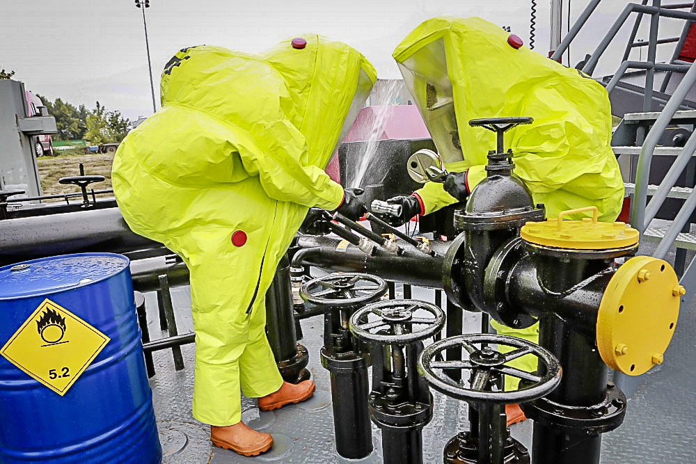 Ein weiterer Übungsabschnitt, der mehr als nur ein Aha-Erlebnis hervorbrachte, ist die Station „Instabiler Container“. Kommt es im Zuge eines Schiffunglücks zu einer Verschiebung der Ladung, können sich zahlreiche Probleme für die Einsatzkräfte ergeben. Das gilt allerdings auch bei Unfällen mit Lkw oder Zügen, die Container geladen haben. Hier kann der spezielle Seecontainer horizontal um 35° als auch vertikal um 5° verdreht werden. Ladungssicherung bzw. Ladungsbergung und Absicherung des instabilen Du Containers können ebenso geübt werden wie die Rettung von Menschen von unter Deck eines schräg liegenden Schiffes. Auch ein Wassereinbruch bzw. ein gewisser Wasserstand kann hier eingespielt werden. Dem Kontakt von Rettungskräften mit Flüssigkeiten wird viel Bedeutung geschenkt. Auch wenn den Teilnehmern durch die modernen Schutzanzüge von TEXPORT® bestmöglicher Schutz geboten wird, so lernen die Kameraden eine enorm wichtige Verhaltensregel im Zusammenhang mit Schiffs-Havarien: Sobald es zu einem Kontakt im Inneren des Schiffes mit einer Flüssigkeit kommt (egal ob am Schuh oder am Handschuh beim Kriechgang) muss unverzüglich der Weg zurück angetreten werden, um die Flüssigkeit auf Unbedenklichkeit zu überprüfen. Wir erinnern uns, beim Unfall 2011 waren 2.400 Tonnen Schwefelsäure geladen. Doch wenn in einen Container vorgedrungen werden muss, ist nicht immer ersichtlich, um welches Ladegut es sich handelt bzw. ob dieses noch gesichert ist. Bei dieser Station lässt Leutnant Romilly auch gerne Kameraden, welche keine Erfahrung mit instabilen Containern haben, als erstes Hand anlegen. „Kannst du diesen verschobenen Container öffnen und nachsehen, was da los ist?“, lautet dabei die Anweisung. Wer dann zielgerichtet auf den Container zugeht, diesen öffnet und Meldung macht, bekommt zu hören: „Alles klar, nur im Ernstfall wärst du jetzt verletzt oder sogar tot!“ Die Auflösung folgt prompt und ist so einfach wie logisch: Öffne niemals eine ungesicherte Containertüre nach einem Unfall! Es könnten extrem schwere Güter, die sich verschoben haben, auf der Türe lasten und den, der sie öffnet, quasi „erschlagen“.
