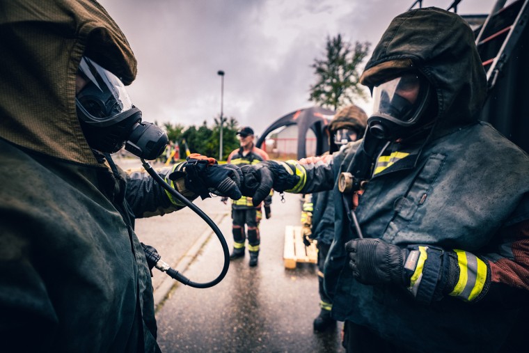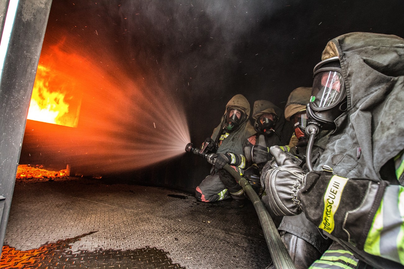 An den Theorieteil anknüpfend schreiten die Teilnehmer zu den fünf Praxisworkshops mit den jeweiligen Themenschwerpunkten. Beim „Schlauch- und Strahlrohrmanagement“ werden das Zusammenspiel von Technik und Taktik erörtert, die momentan gängigsten Systeme vorgestellt oder unterschiedliche Löschmethoden (up & down; Einfangen von Flammen etc.) geübt. Bei der Station „Notfallatemschutz“ erfahren die Teilnehmer mitunter, wie lebensbedrohliche Probleme entstehen können und wie man diese wieder lösen kann. Der Workshop „Gurt- und Haltesystem“ klärt die Frage, wann welches System (z.B. mit integriertem Rückhaltegurt) in Verbindung mit der Schutzkleidung am sinnvollsten ist und wie man diese Gurtsysteme richtig anlegt. Wie man als Einsatzkraft bei einer Gefahrenlage vorgeht und dabei möglichst wenig Schaden verursacht, wird im Workshop „Einsatzmanagement“ behandelt. Aber auch der richtige Einsatz von z.B. Lüfter ist Gegenstand dieser Station. Höhepunkt und Highlight ist jedoch die Realbrandübung in einem mit Holz befeuerten Container. In dieser „Rauch- und Flammenhölle“ sind die Teilnehmer Temperaturen bis zu 700 Grad Celsius ausgesetzt. Entsprechend penibel wird der Gesundheitszustand der Teilnehmer vorab erfragt. Wer in den letzten Tagen etwa eine Erkältung hatte, kann aus Sicherheitsgründen nicht in den Container geschickt werden. Selbst die Einnahme gewisser Medikamente vor den ACTION DAYS stellt einen Ausschlussgrund dar. Hier steht eben Sicherheit an oberster Stelle, immerhin muss man in dieser Situation wirklich an seine Grenzen gehen. Das bestätigte auch einer der Teilnehmer: „Es wird dir wirklich etwas abverlangt. Die gefühlt kurze Zeit im Container ist extrem hart, aber auch genauso lehrreich!“ Dass die Teilnehmer in dieser Zeit gut einen Liter Flüssigkeit verlieren, beweist wie anspruchsvoll diese Workshop-Station ist. Seit 2018 gibt es bei dieser Station eine sehr begrüßenswerte Neuerung. Da sich die ACTION DAYS mitunter auch dem Thema der Kontamination durch Brandrauch und der daraus entstehenden Gefahr für Feuerkrebs widmen, erhält jeder Teilnehmer nun nach dem Gang in den Brandcontainer eine zweite Garnitur zum Wechseln. „Lange Zeit wurde das Gesundheitsrisiko durch verschmutzte Schutzkleidung unterschätzt. Um hier mit gutem Beispiel voranzugehen, statten wir alle Teilnehmer nach der Brandübung mit einer neuen und sauberen Garnitur von TEXPORT® aus“, erklärt der Ausbildungsleiter dieses verantwortungsvolle Vorgehen.