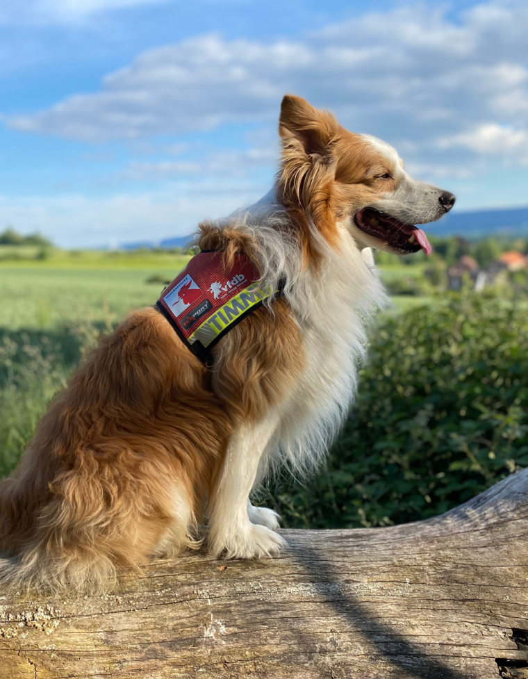 Timmy also appears at the REAS trade fair in Italy in his role as “Loveable Ambassador”, so he often travels from Hanover to Montichiari. During one of these business trips, Timmy made a stopover to see us in Salzburg. The entire TEXPORT team succumbed to the charm of the four-legged media professional right away – how could we not? – and so it soon became clear that we wanted to equip Timmy with a tailor-made identifying harness, the kind worn by rescue and assistance dogs. So Timmy is now stylishly equipped with his “uniform”, which bears the INTERSCHUTZ and vfdb logos, for his big appearance in June.