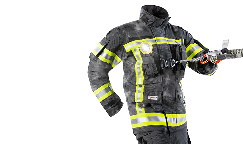 There are three harnesses, each with their own closure system. The harnesses can be supplemented with a self-protection loop or a webbing sling in combination with various carabiners to form a complete IRS (Integrated Rescue System). This means that the IRS can be flexibly adapted to the needs and requirements of the fire service. When the belt is not needed it disappears inconspicuously but protected in the assembly tunnel which is integrated fully through the jacket. This means that no important components inside the jacket, such as the membrane, are damaged. Our threading-in aid makes it much easier to thread and unthread the belt – which is necessary before as well as after a washing process.
