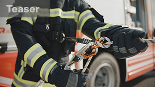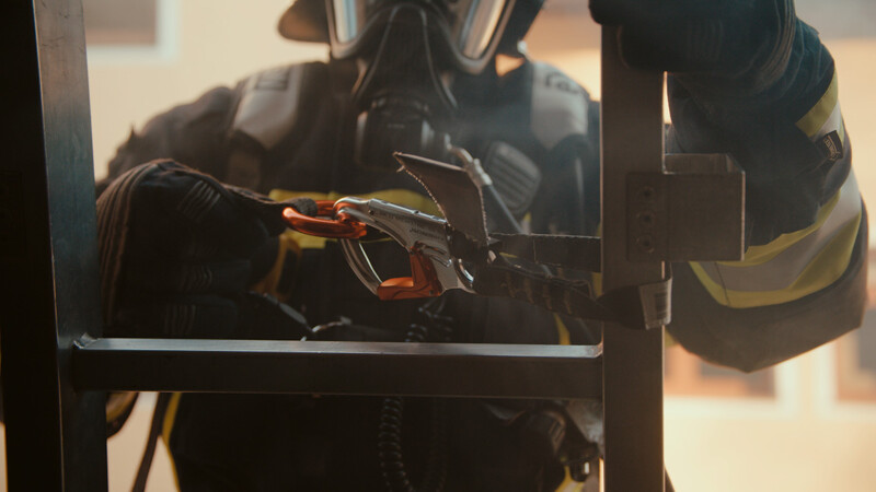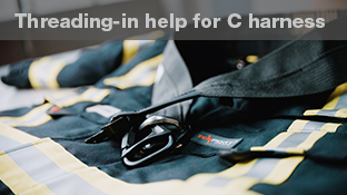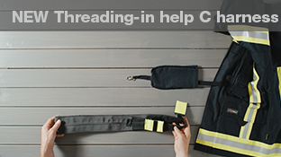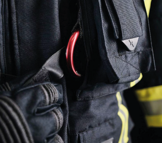 with currently three different harnesses, each with its own closure system. The harnesses can be supplemented with a self-protection loop or a webbing sling in combination with various carabiners to form a complete IRS (Integrated Rescue System). This means that the IRS can be flexibly adapted to the needs and requirements of the fire service. When the belt is not needed it disappears inconspicuously but protected in the assembly tunnel which is integrated fully through the jacket. This means that no important components inside the jacket, such as, for example, the membrane, are damaged. Our threading-in aid makes it much easier to thread and unthread the belt – as is necessary before as well as after a washing process.