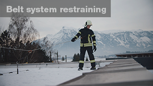 The harness / rescue system serves to avoid a fall when emergency services are working on rooftops or similar. As a restraint system, this enables a secured descent into uneven terrain, such as slopes. The firefighter is secured in position and held back from the falling edge. In the case that the falling edge cannot be reached, the possibility of a fall can be eliminated. The possible fall distance must be limited to a maximum of 0.5 m.
