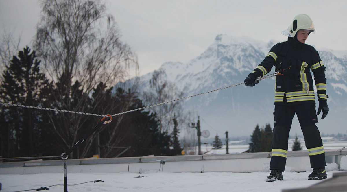 The harness / rescue strap ensures safety of the standing position and enables a working position that avoids freefalling. The possible fall distance must be limited to a maximum of 0.5 m. Areas of use include work on ladders, for example, in which case the personnel can lean into the tense extended system and keep both hands free without a risk of falling.